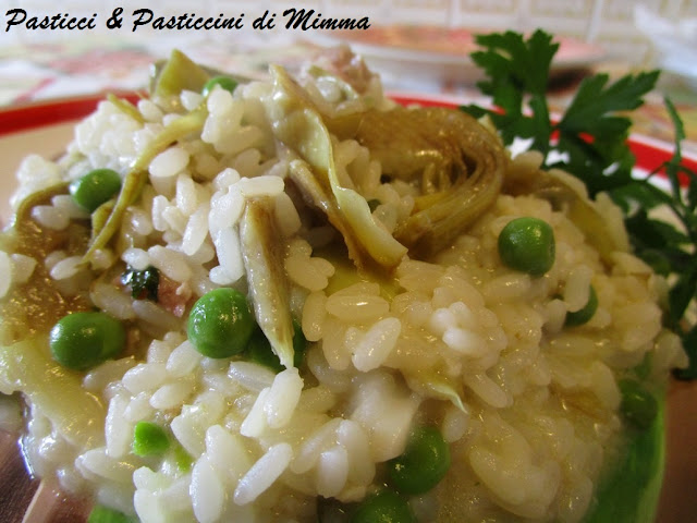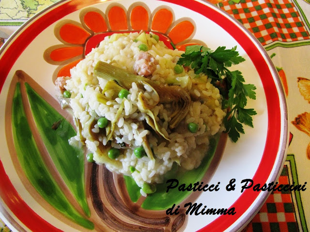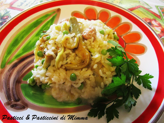 Cosa c’è di piu’ buono di un risotto con i carciofi e piselli e arricchito da un tocco di gusto piu’ intenso della salsiccia..???