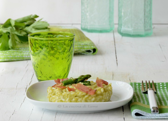 Sembra che finalmente la bella stagione sia arrivata, il sole, il cielo terso, le temperature nella norma stagionale … auguriamoci che il clima pazzerello e piovoso di questo ultimo periodo ci abbia abbandonato definitivamente. Non so voi, ma io non ne posso più di scarpe chiuse e trench, ho voglia di sandali, di vestiti leggeri, di lunghe passeggiate, di week end al mare, di ritornare a vivere la città anche di notte…insomma ho una gran voglia di estate! Ovviamente per la maggior parte di noi parlare di estate vuol dire anche parlare di prova costume e allora che ne dite di dimenticare per un pò i dolci super golosi e di rivolgere la nostra attenzione a piatti salati e non troppo ricchi? Questo risotto ad esempio copiato dal bellissimo blog della dolce Imma è perfetto, ovviamente se mangiato nella giusta quantità, un piatto gustoso, ma sano la cui base è un ortaggio, l’asparago, ricco di acqua e povero di grassi, con un’ ottima concentrazione di fibre e di vitamine, dalla A alla C e una notevole ricchezza di sali minerali, ortaggio spesso molto consigliato nelle diete. Non sono un nutrizionista e non vi certifico che sia un piatto light, ma sono sicura che possa rientrare tra quelli leggeri adeguati ad un regime alimentare controllato.