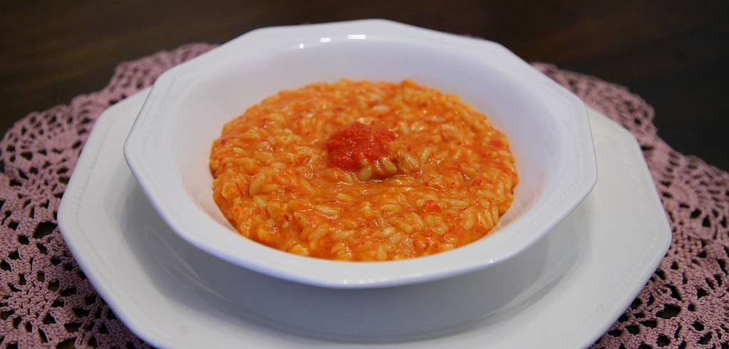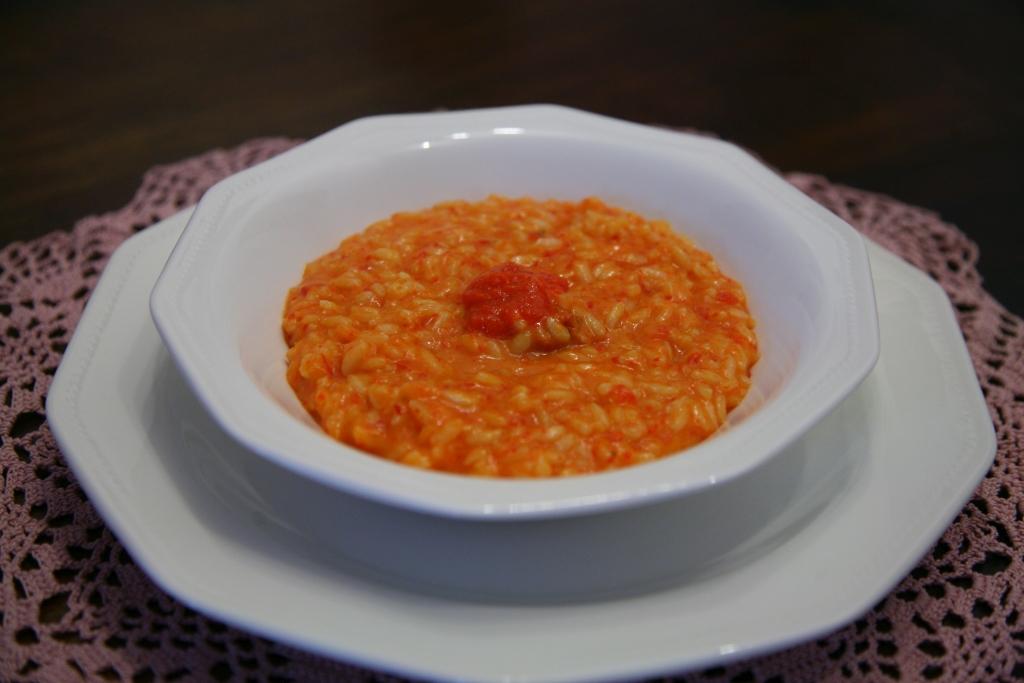 Un risotto dal colore rosso-arancio intenso e non è il classico risotto al pomodoro, anzi il pomodoro non c’è proprio.