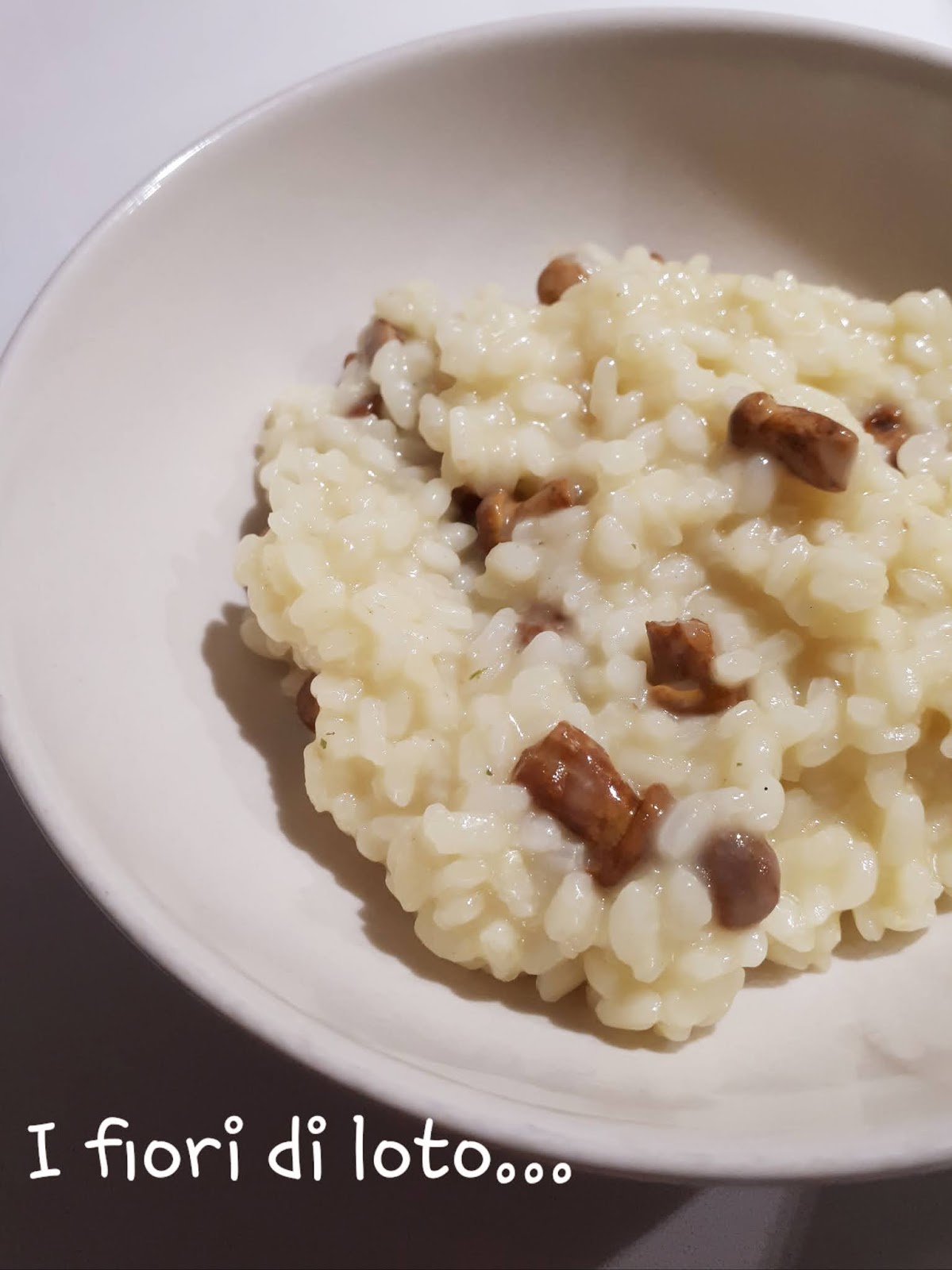 Ora che i funghi sono pronti togliete l’aglio, e aggiungete il riso lasciate cuocete versando il brodo caldo con un mestolo (io l’ho preparato con del dado bio vegetale) un po’ alla volta, mescolando spesso e aspettando che il riso abbia assorbito tutta l’acqua.