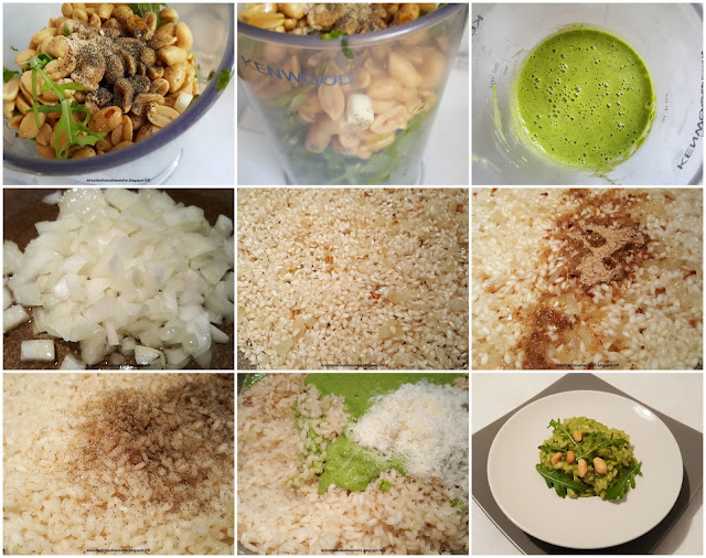 - Preparare per prima la salsa di rucola e arachidi : Lavare la rucola, metterla nel bicchiere del frullatore a immersione insieme agli arachidi, olio, i 20 gr di grana a cubetti, un mestolino di acqua bollente, un pizzico di brodo e pepe e mettere in funzione. Frullare fino ad ottenere una crema abbastanza fluida e liscia.