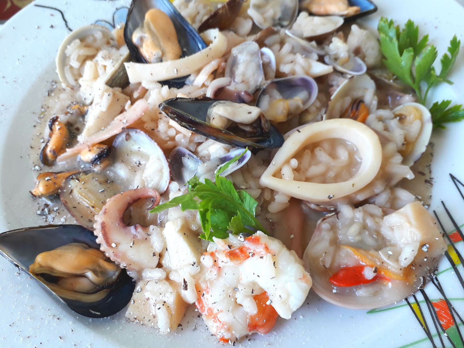 togliamo poi i pezzi e aggiungiamo una noce di burro,versiamo di getto il riso,tostiamo e sfumiamo con un ‘altro bicchierino di vino,evaporato il vino iniziamo ad aggiungere brodo per la cottura del riso,A meta’ cottura uniamo anche i molluschi tutti(tranne i gamberi ),prezzemolo,pepe e solo s occorre un pizzico di sale,continuiamo la cottura e solo negli ultimi minuti aggiungiamo tutti frutti di mare ed i gamberi a pezzetti,lasciamo insaporire il tutto e serviamo con qualche cozza nel guscio ed una spolverata di pepe!!