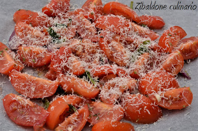 Preparare i pomodori al forno: dopo aver lavato e tagliato a pezzi i pomodorini, condirli con olio, aglio cipolla, basilico e origano, aggiustare con sale, pepe e zucchero. Sistemare i pomodori nella teglia del forno dopo averla foderata con carta forno. Grattugiare una generosa manciata di parmigiano e poi infornare a 160°C per circa 30 minuti e fino a quando non si sarà formata una bella crosticina in superficie.
