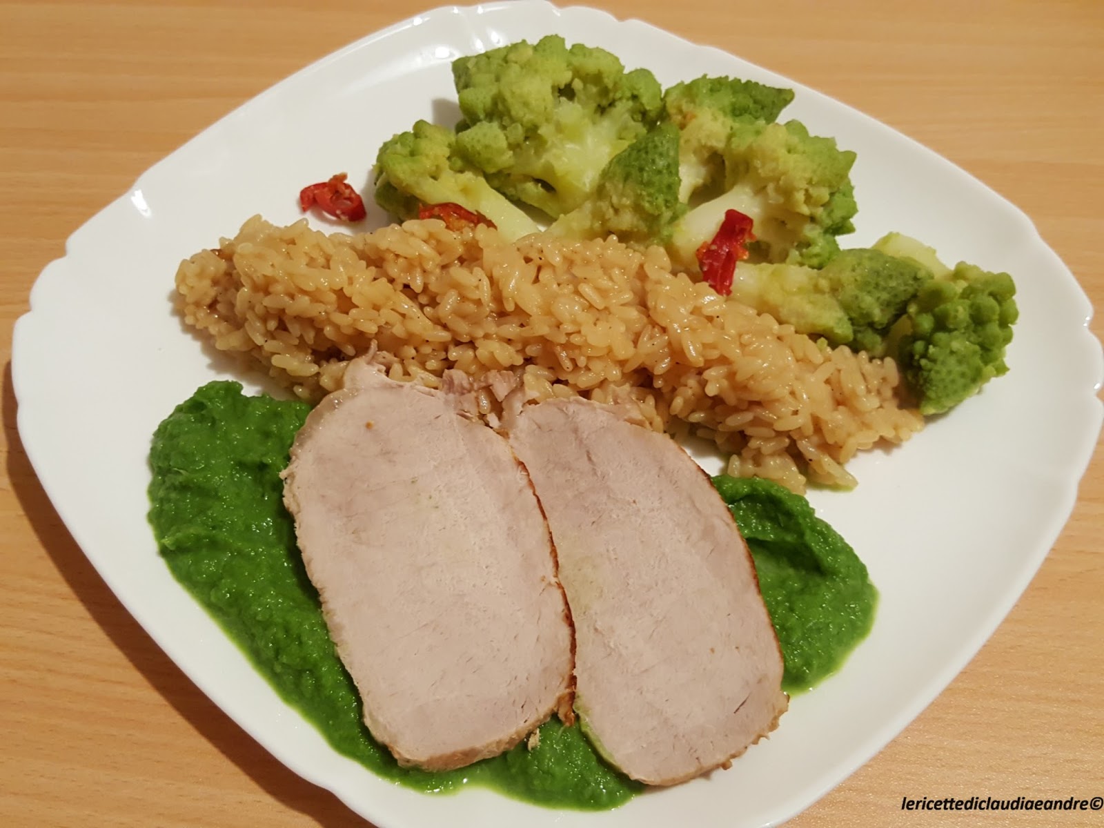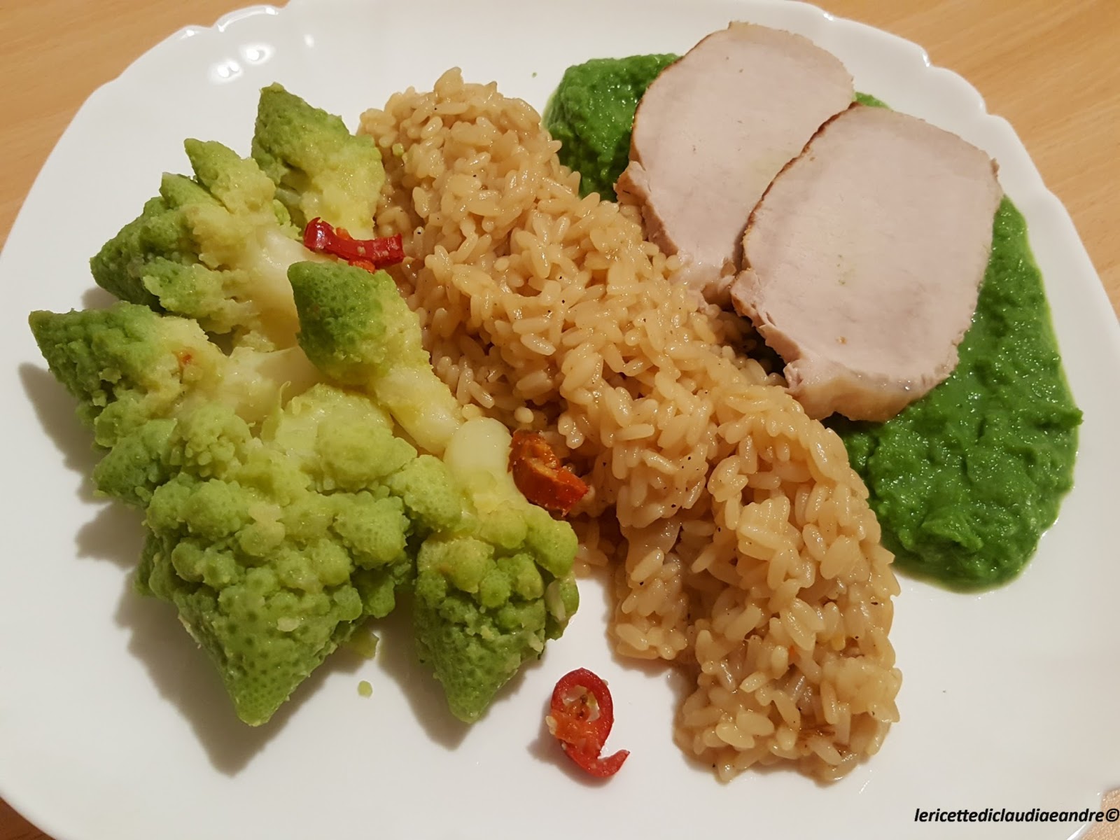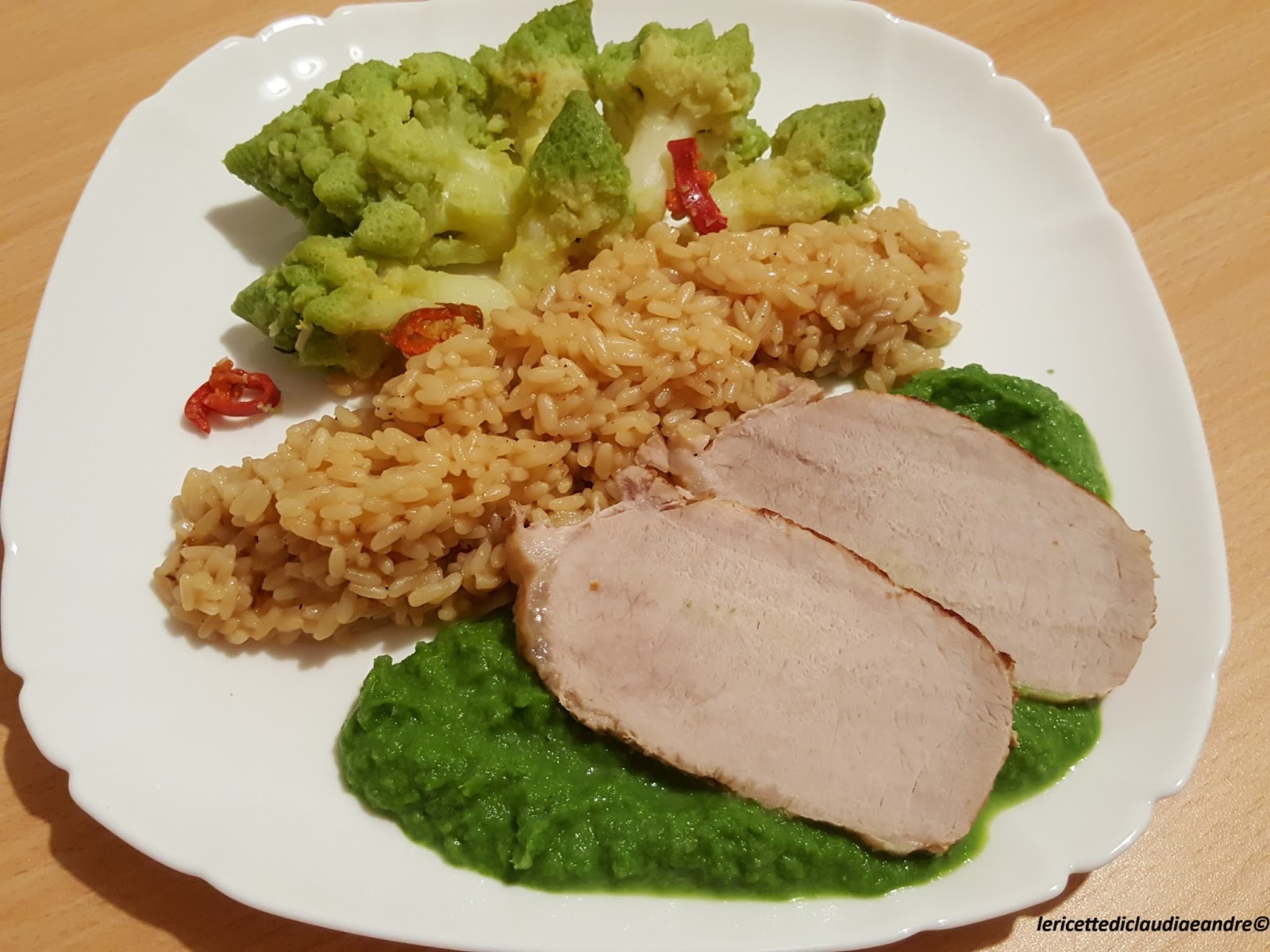 Risotto e fettine di lonza su salsa di cavolo romanesco