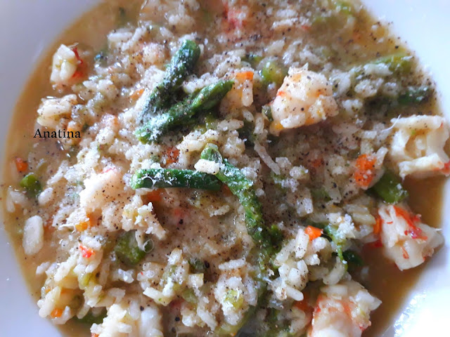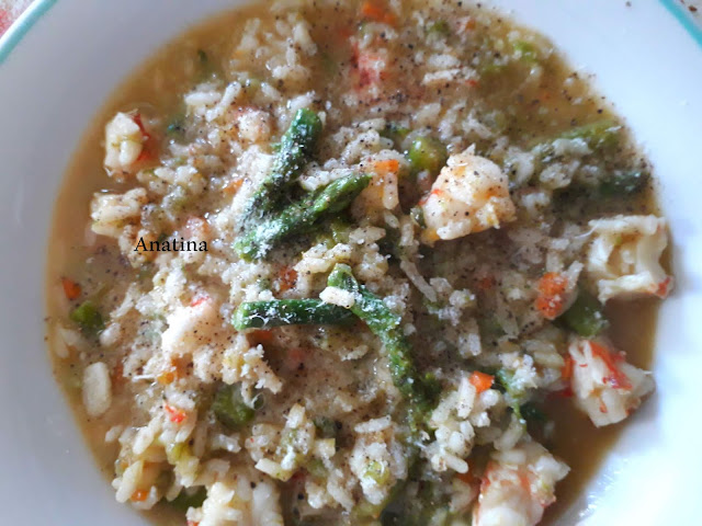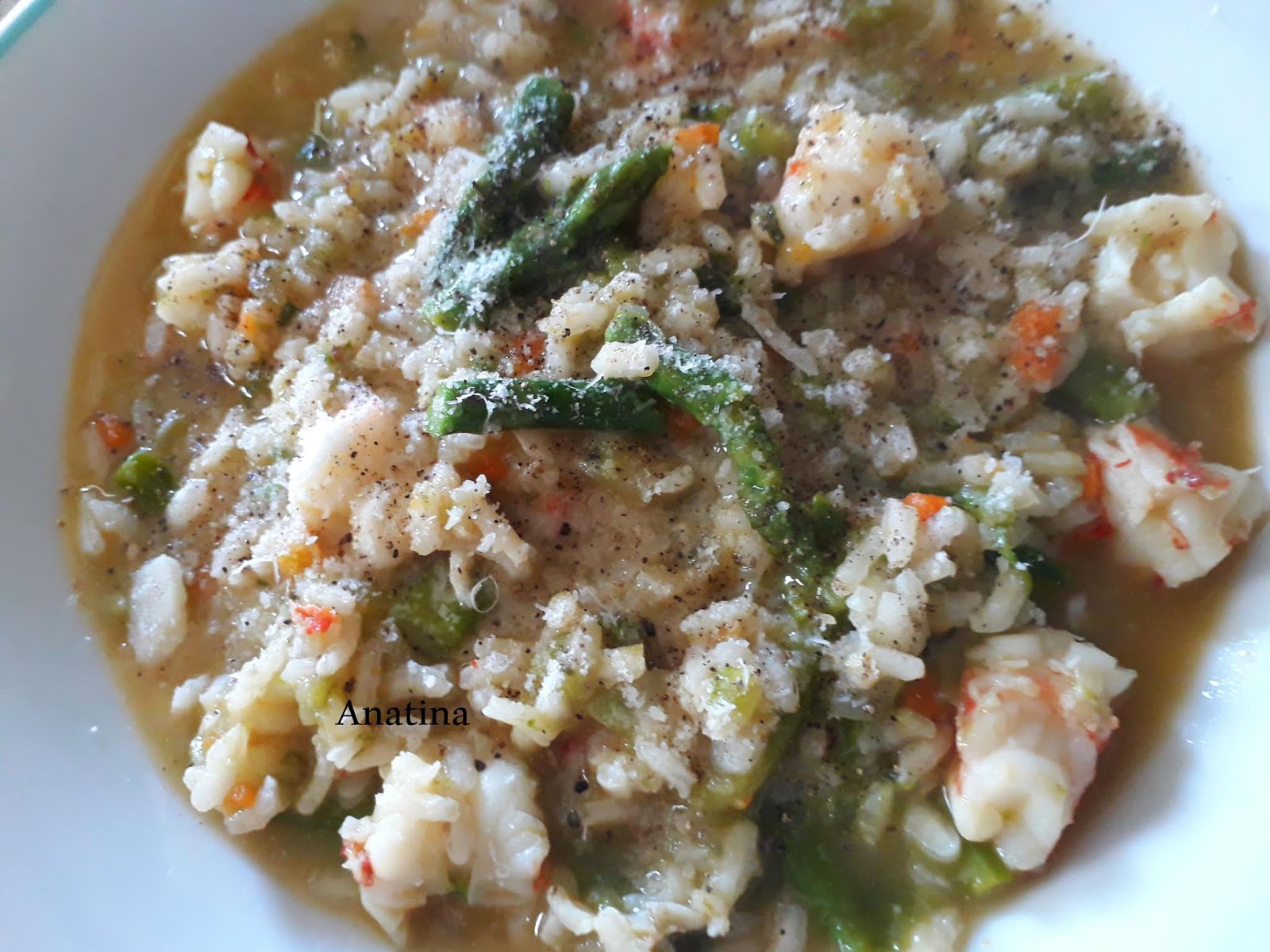 dei gamberi,versiamo il riso ed iniziamo ad aggiungere mano a mano il brodo e i restanti gamberi e asparagi fino a cottura ultimata.Ora assaggiamo per vedere la sapidita’ e se occorre uniamo una