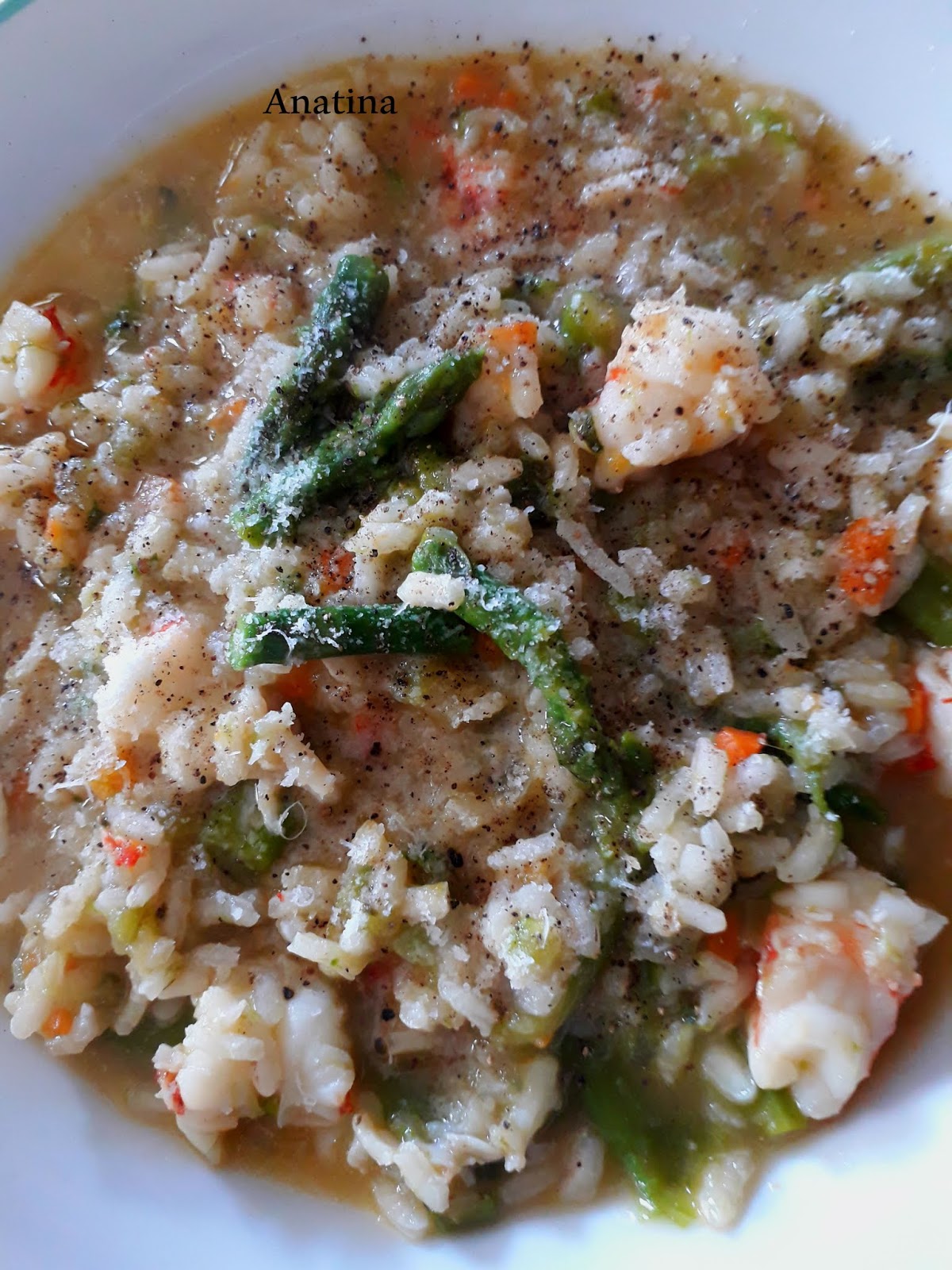 dei gamberi,versiamo il riso ed iniziamo ad aggiungere mano a mano il brodo e i restanti gamberi e asparagi fino a cottura ultimata.Ora assaggiamo per vedere la sapidita’ e se occorre uniamo una