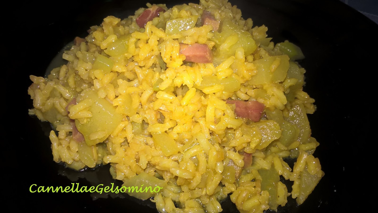 Ingredienti per 4 persone: 2 zucchine spinose, 240 g di riso integrale, 100 g di speck, un cucchiaio di curcuma, una cipollina, brodo.