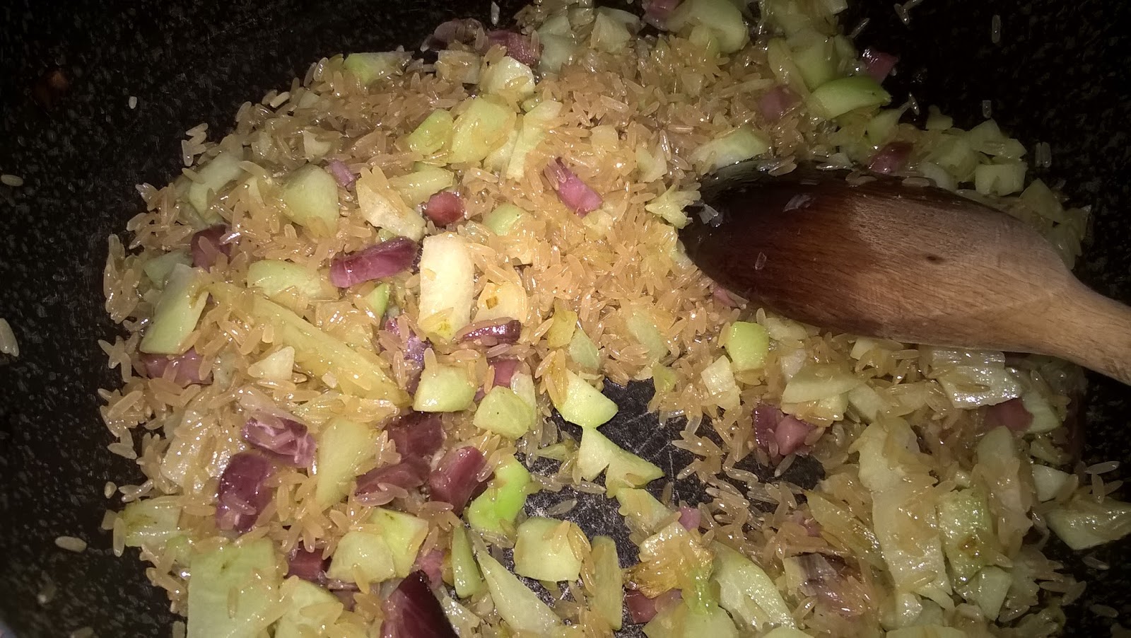 Aggiungete il riso (io ho usato quello integrale), fate tostare, quindi proseguite la cottura con del brodo caldo.