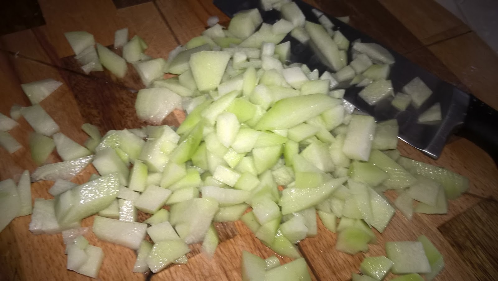 Sbucciate le zucchine servendovi di un paio di guanti, tagliatele a fette e poi a cubetti.