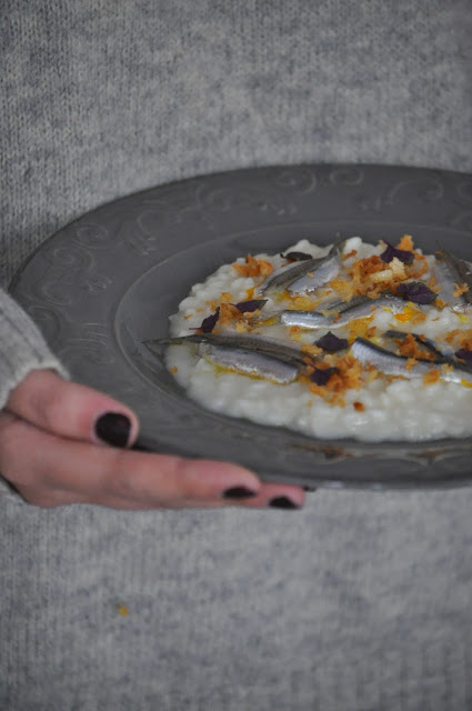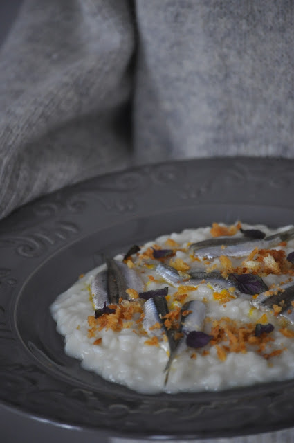 Il risotto di oggi è speciale. Cremoso e croccante allo stesso tempo. Profumato e saporito, fresco e decisamente irresistibile. Guarnito da alici marinate nella scorza e nel succo d’arancia e briciole di pane toscano arrostito in olio evo e rosmarino.