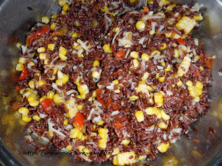 Lessare le pannocchie in pentola coperte d’acqua per 20 minuti, lasciarle raffreddare e tagliarne via i chicchi tenendoli da parte. Lessare il riso secondo i tempi previsti, scolare l’acqua di cottura ed unire al mais. Affettare a fiammifero le patate senza la buccia e tagliare finemente i peperoni. Scottare le verdure in padella con due cucchiai d’olio per qualche minuto, mescolare e far andare ancora un paio di minuti. Versare patate e peperoni su una teglia con cartaforno e livellare. Cuocere in forno a 190° per 30 minuti. Unire le verdure al riso, aggiungere un pizzico di sale, un filo d’olio, mescolare bene e portare in tavola.