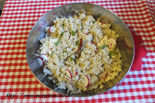 Cuocere il riso. Scottare gli asparagi con la cipolla affettata pochi minuti in padella con un filo d’olio, unire al riso ed aggiungere sale, pepe e peperoncino. Quando sarĂ raffreddato aggiungere i ravanelli affettati sottilmente.