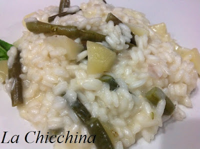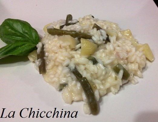 Preparazione: per prima cosa sbollentare i fagiolini per dieci minuti, per accellerere la cottura spezzettarli.