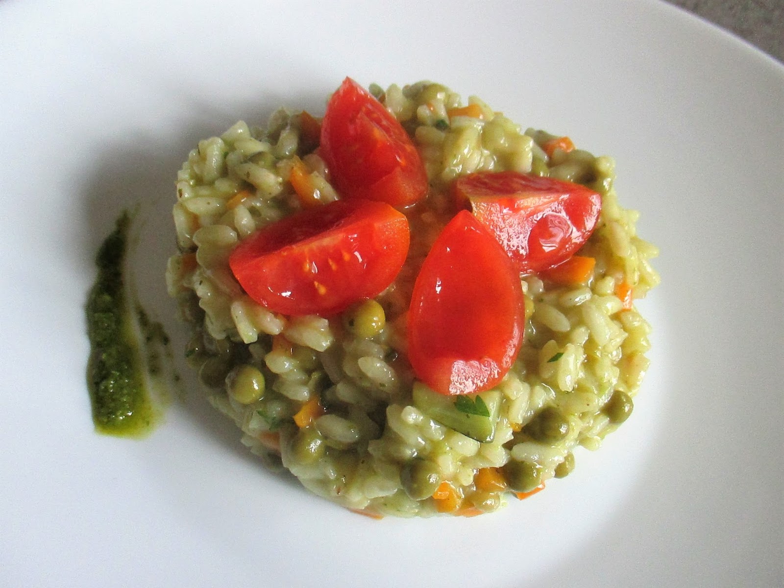 In a pan, make a fried with oil and shallots. Toast the rice then add the white wine and let evaporate all the alcohol. Add 2 ladles of broth and cook for about 15 minutes, adding broth as needed. Then add the peas, tomatoes, asparagus, carrots and zucchini and cook for another 5 minutes. At the end of cooking stir in the pesto, the tablespoon of olive oil of olives and serve immediately hot.