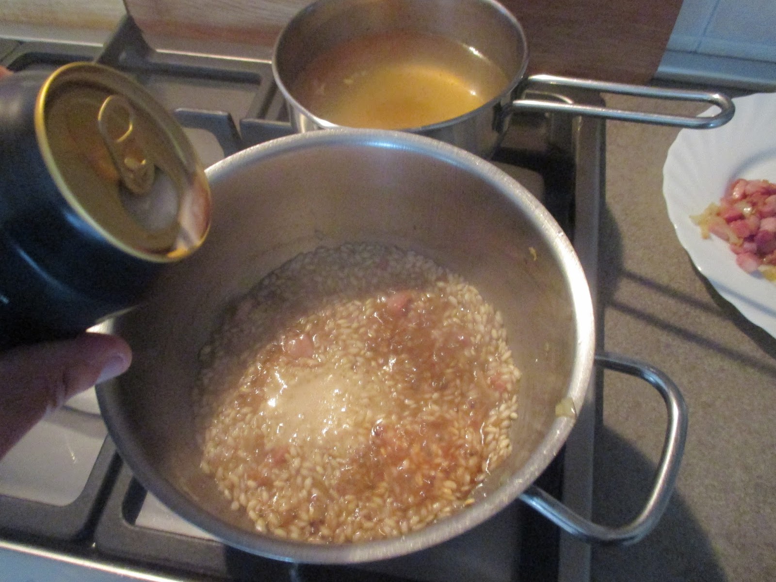 In the same skillet, toast the rice, then add about 33 centiliters of beer and let it evaporate completely alcohol. United 2/3 ladles of broth and cook for about 10 minutes.