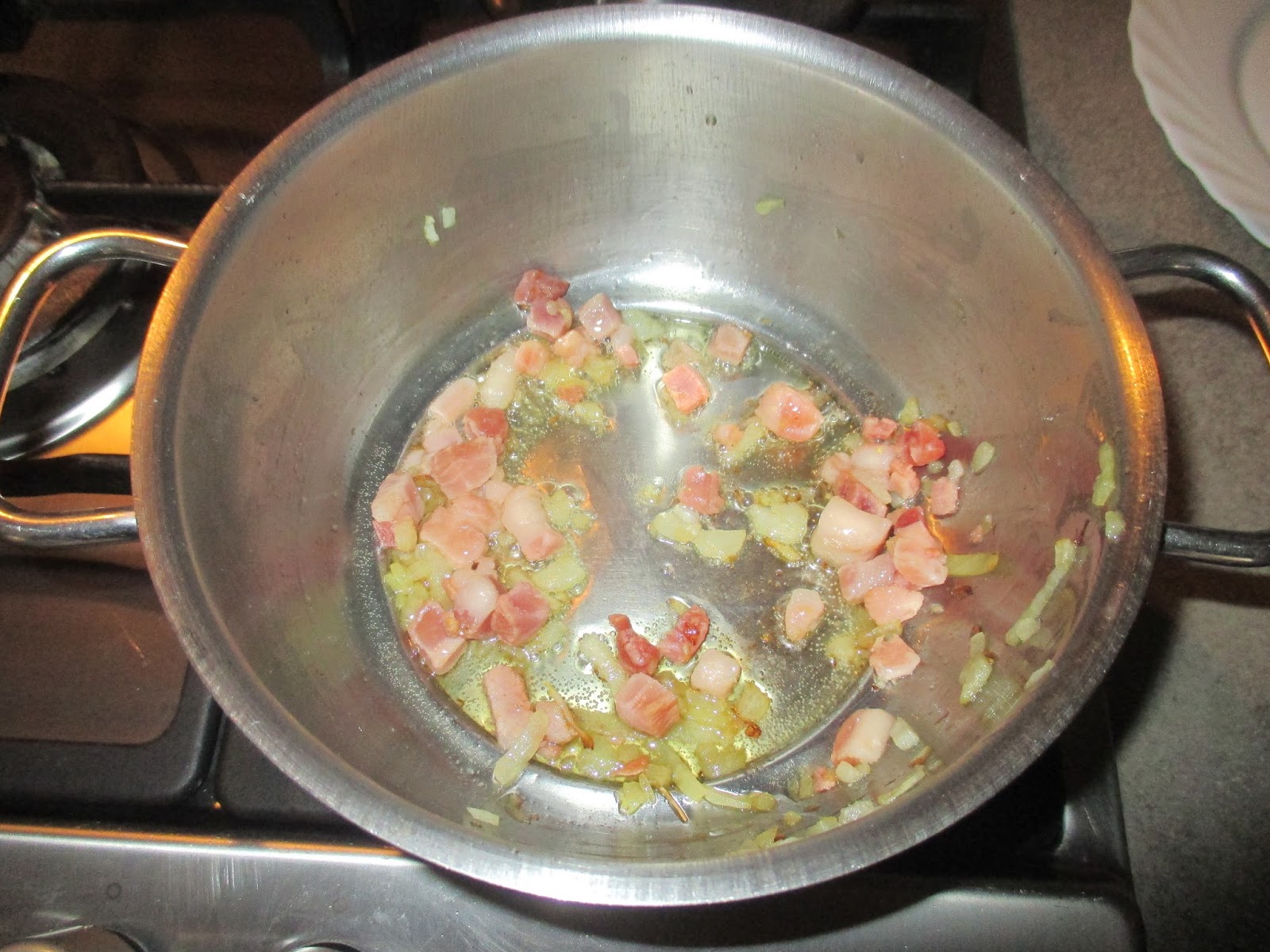 In a pan, fry a tablespoon of oil with half a shallot. Brown the bacon then remove and set aside.