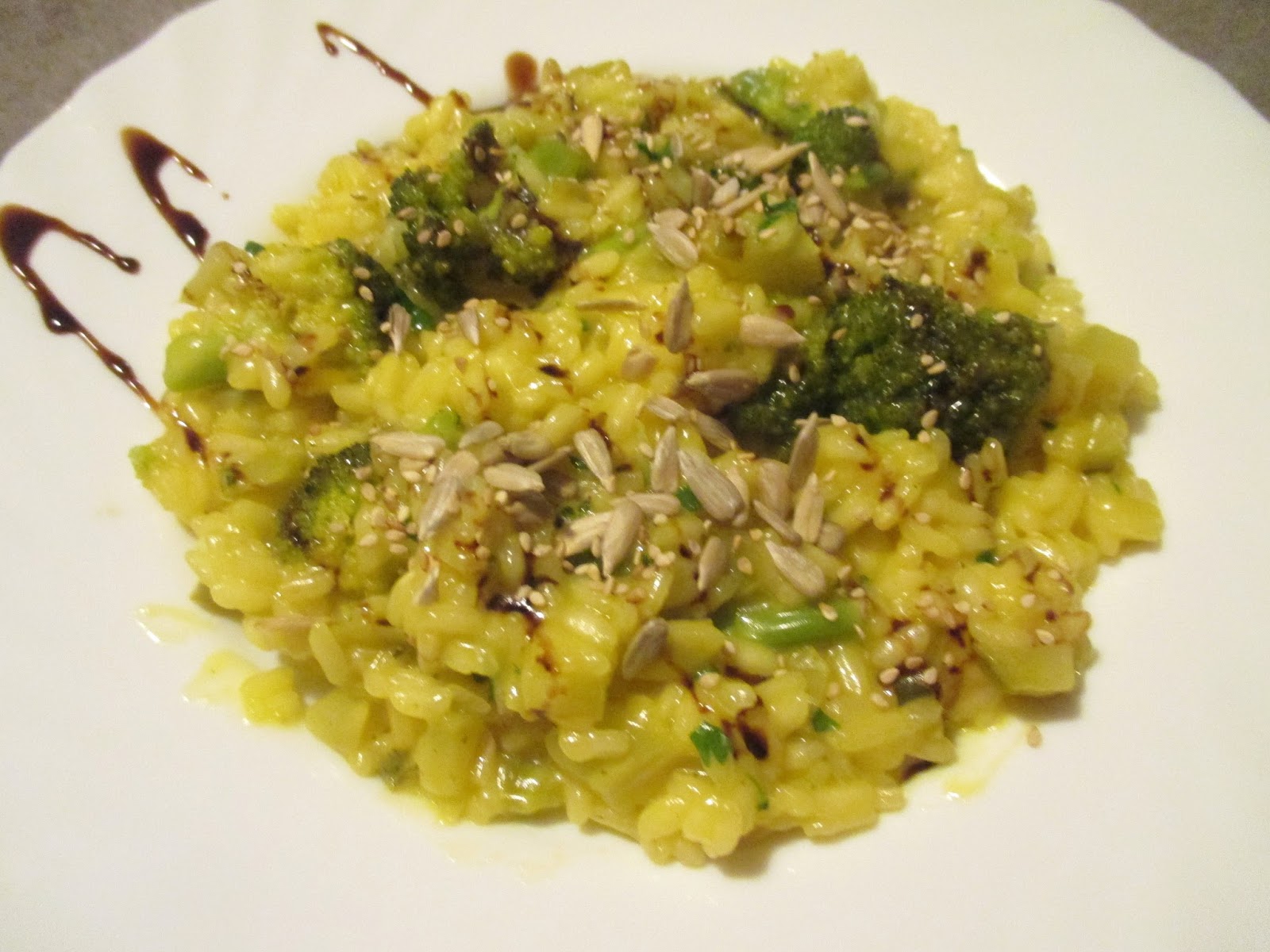 In a skillet, fostate the rice in a little oil and shallots. When it’s ready, pour the white wine and let evaporate all the alcohol Add a couple of ladles of broth and cook for about 15 minutes. then add the saffron and broccoli and cook for another 5/8 minutes. A obtained cooking, turn off the heat and stir in butter and Parmesan cheese. Serve hot with the balsamco vinegar from Modena.