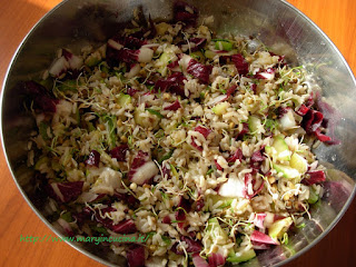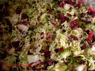 2 zucchine, 1 cipollotto, 1/2 radicchio, 1 manciata di germogli di lenticchie, 140 gr riso integrale, olio extravergine d’oliva, sale integrale.
