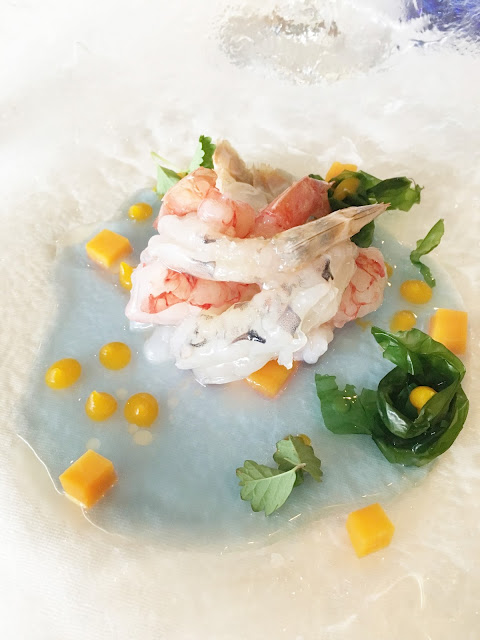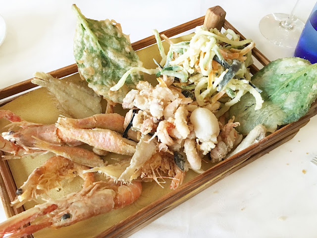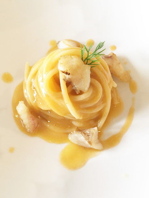 Ma ora passiamo ai piatti… abbiamo iniziato con una crudità di crostacei “autunno inverno” con con zucca, aceto di mele e cavolo viola. Poi il fritto di pesci, molluschi e crostacei, piacevolmente sorpresa dalla foglia di borragine fritta. Un inizio perfetto che è proseguito con uno spaghetto al succo di scorfano dal sapore intenso e cremoso.