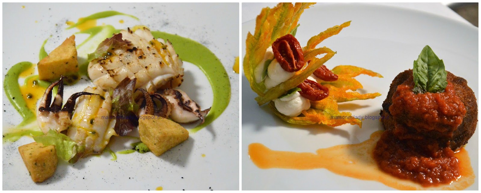 Donna Maria (Fiore di zucca croccante ripieno di ricotta, pomodoro confit e basilico + parmigiana di melanzane a modo mio)