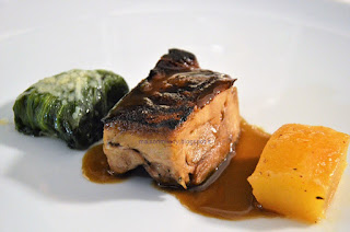 Seppia scottata, crema di piselli, scagliozzo di ceci e frutto della passione