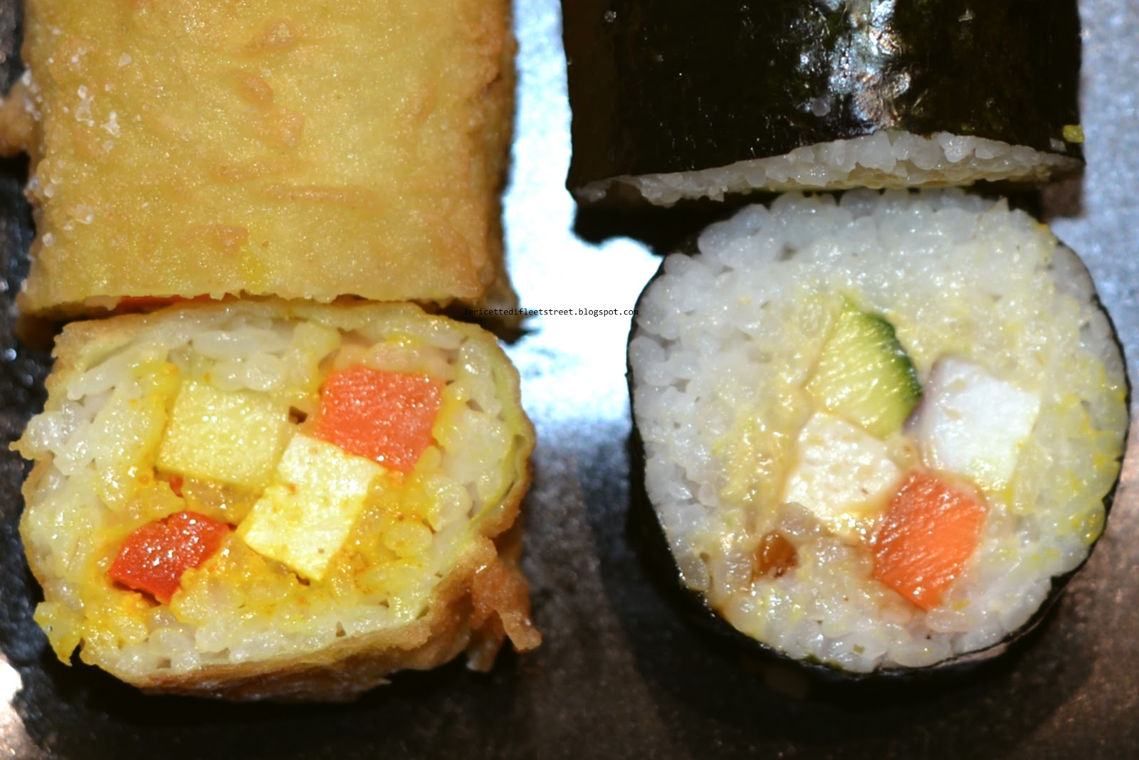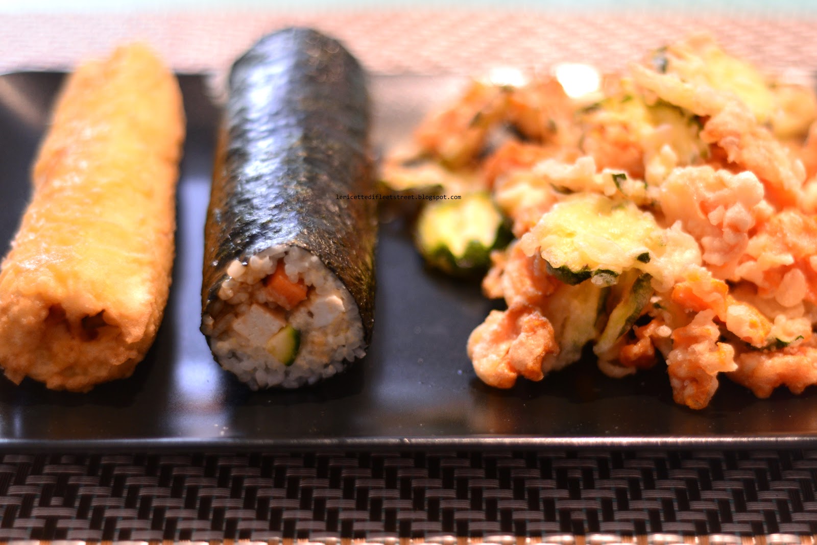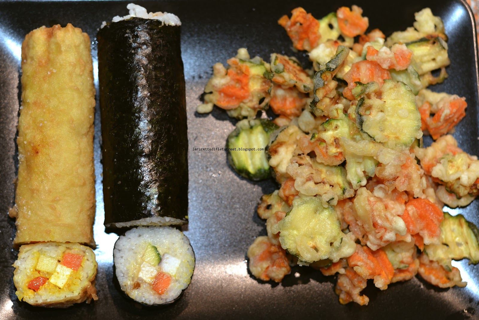 Invece vendevano roll di riso.. vegetariani, carne, pesce.. un sushi bislungo ed alternativo con contorno di zucchine e carote in tempura. Un prezzo modesto per un buon pranzetto alternativo.