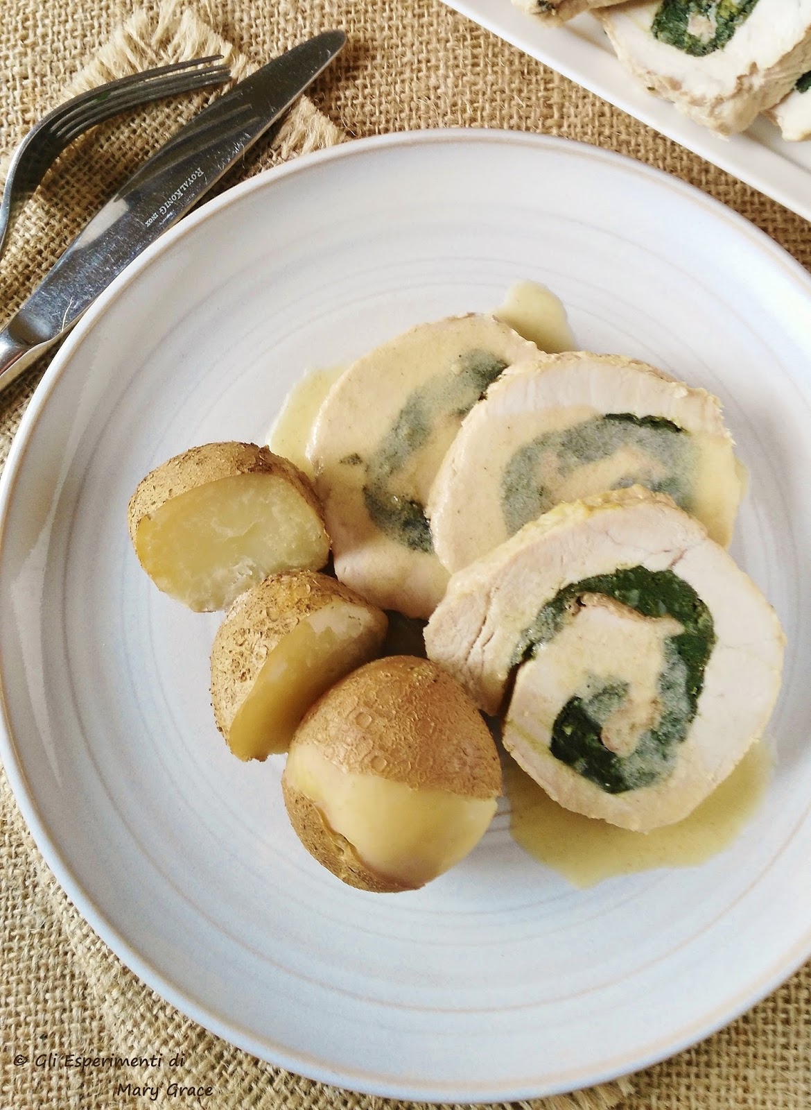 Raccogliere qualche cucchiaio del fondo di cottura della carne e trasferirlo in una ciotolina. Unire un cucchiaino di farina d’orzo e mescolare fino ad ottenere una cremina fluida e non troppo densa. Versare un velo di salsa sulle fettine di lonza arrotolata e servire con le patate al vapore.