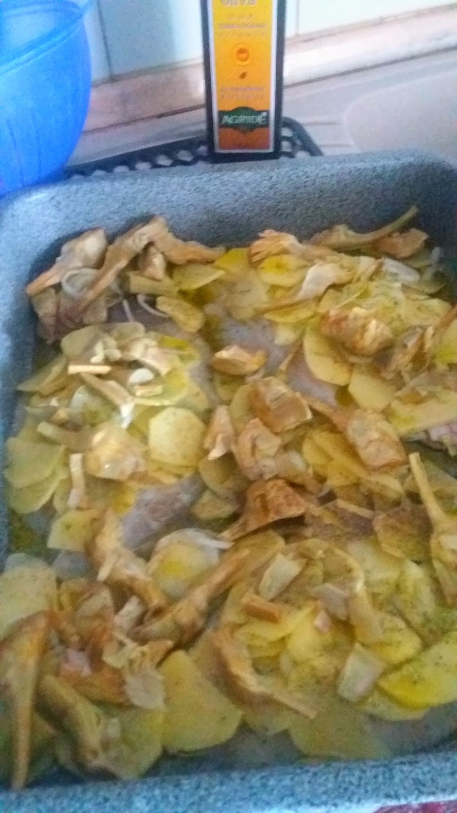 Tagliare patate e cipolle,unire i carciofi e condire il tutto con olio,sale e pepe