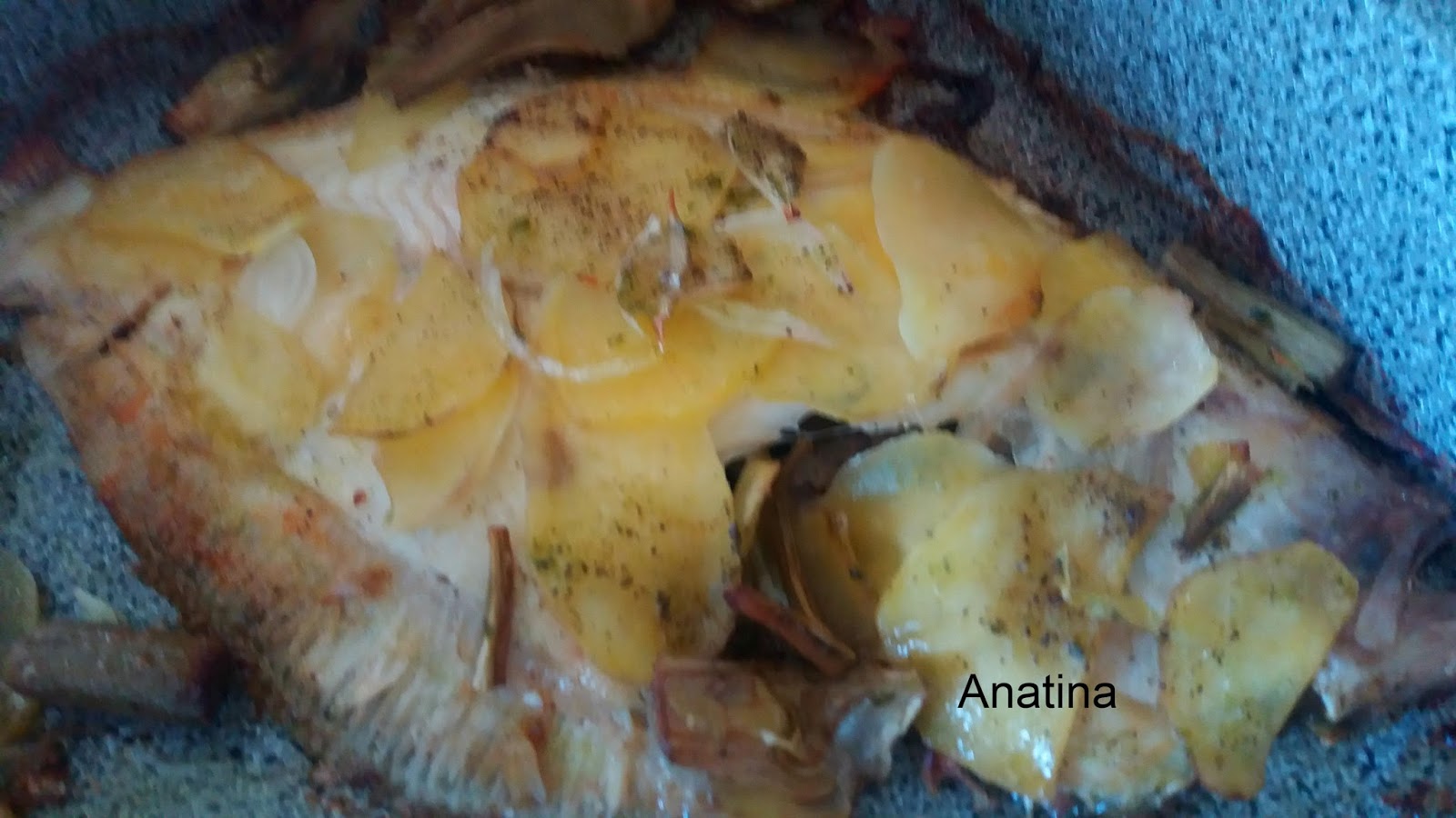 Mettere in una teglia un filo d’olio,poggiare i rombi e coprire con le suddette patate e carciofi,