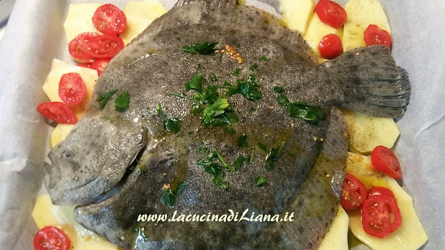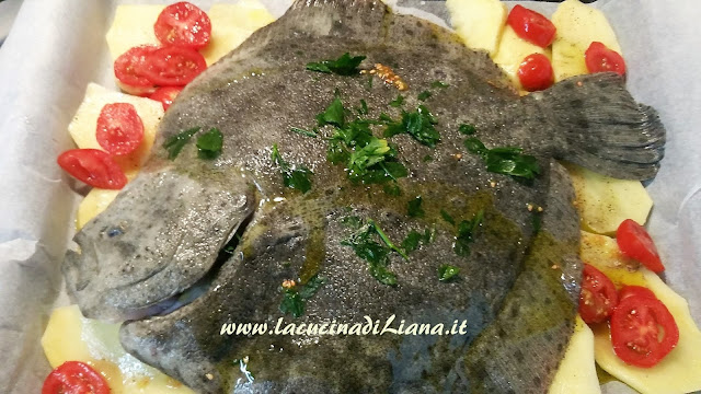 Su un foglio di carta forno stendere un letto di fette sottili di patate,salare pepare e irrorare con un filo di olio, aggiungere e qualche pomodorino tagliato a metà, adagiarvi il rombo, irrorare con un filo di olio la superficie, cospargere di sale, pepe e prezzemolo tritato, e infornare a 180 ° per 25 minuti.