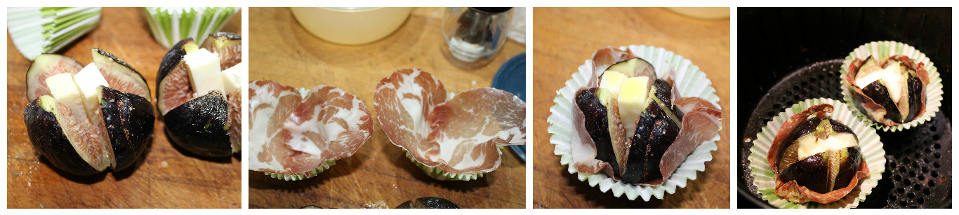 Tagliate il formaggio in 4 bastoncini ed infilateli all’interno dei fichi dopo averli salati e pepati. Foderate i pirottini di carta con le fettine di coppa e sistemateci all’interno i fichi. Trasferiteli in forno oppure nel cestello della friggitrice e cuocete finchè il formaggio sarà fuso e la coppa croccante. In forno ci andranno 10 minuti abbondanti nella friggitrice ad aria a 200° qualcosina di meno tipo 8 minuti.