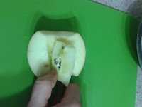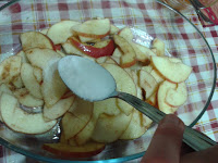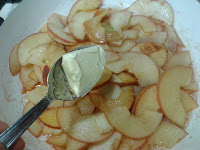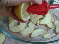 Lavate le mele , dividetele a metà , privatele del torsolo ed eliminate le estremità. Senza sbucciarle tagliatele a fettine molto sottili di circa 2/3 millimetri. Ponetele in una terrina e bagnatele con il succo di mezzo limone. Aggiungete lo zucchero semolato e la cannella, amalgamate e versate il tutto in una padella larga.