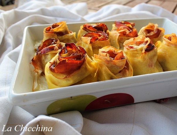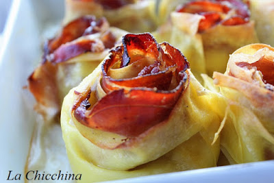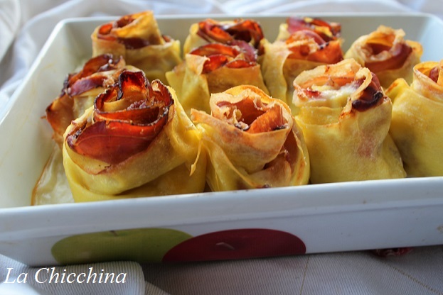 La ricetta di oggi è veramente golosa e pure bella da vedere: delle rose di pasta per lasagne farcite con funghi, besciamella, speck e adagiate su un letto di besciamella leggera.