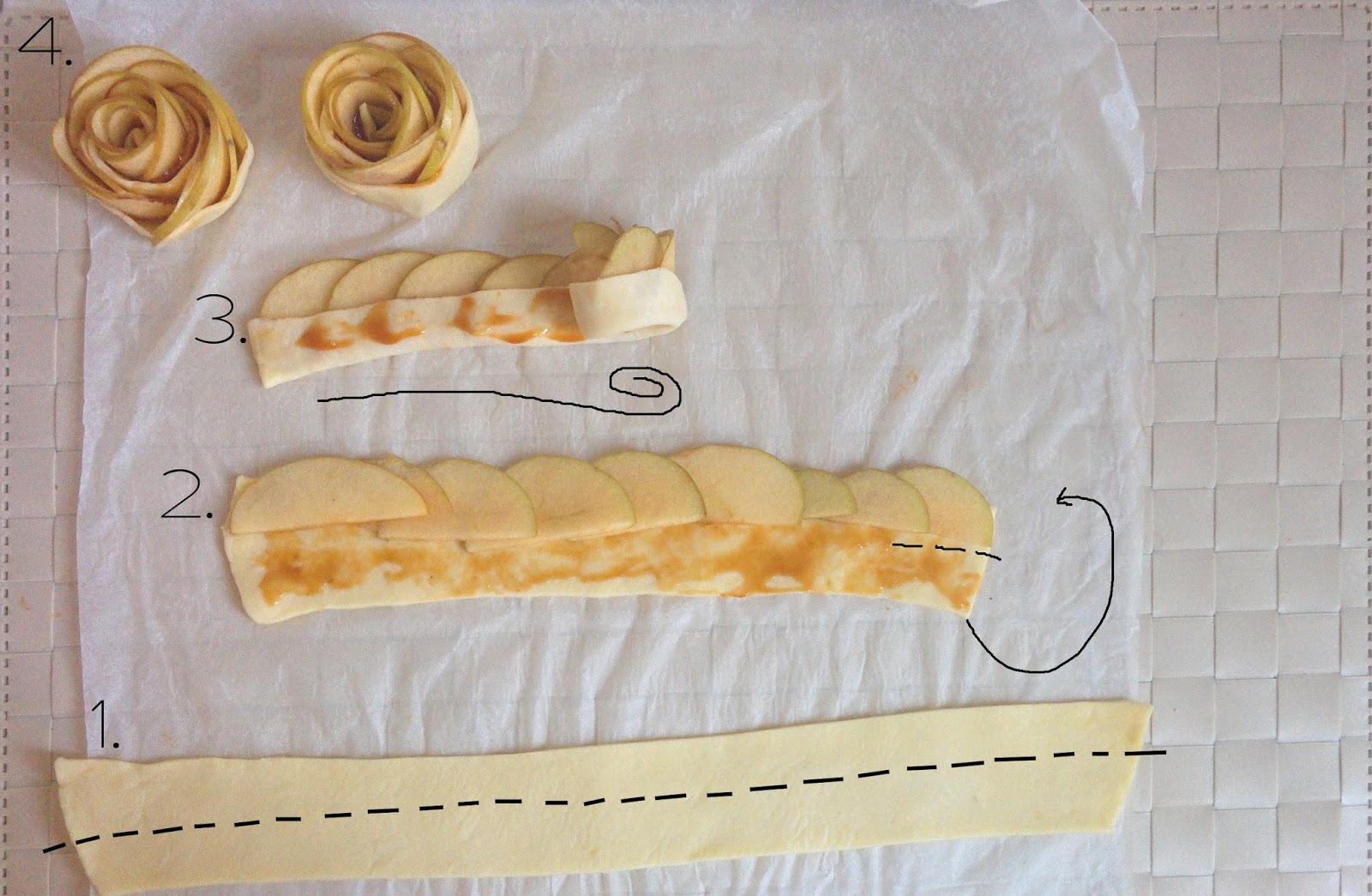 Potete aiutarvi con un po’ di marmellata, che vi servirà anche per richiudere la striscia su sé stessa e poi arrotolarla a formare una rosa (vedi img.).