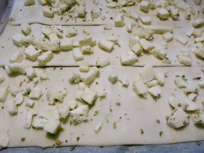 Spolverizzare la base di sfoglia con poco sale, origano e i dadini di mozzarella…