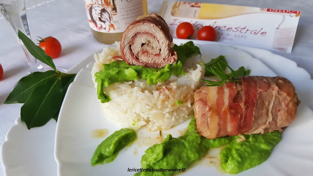 Rotolini di filetto di vitello all’Ancestrale con fondo Iseldo, con riso basmati su crema di piselli