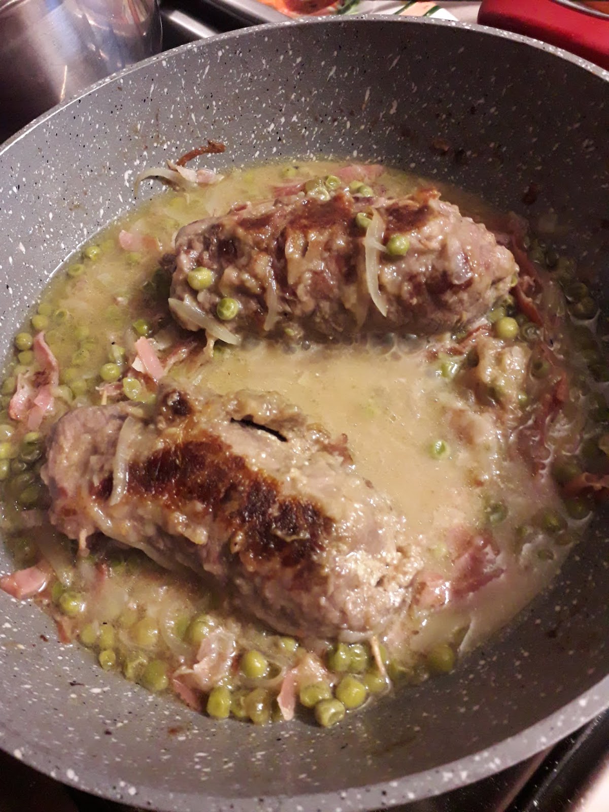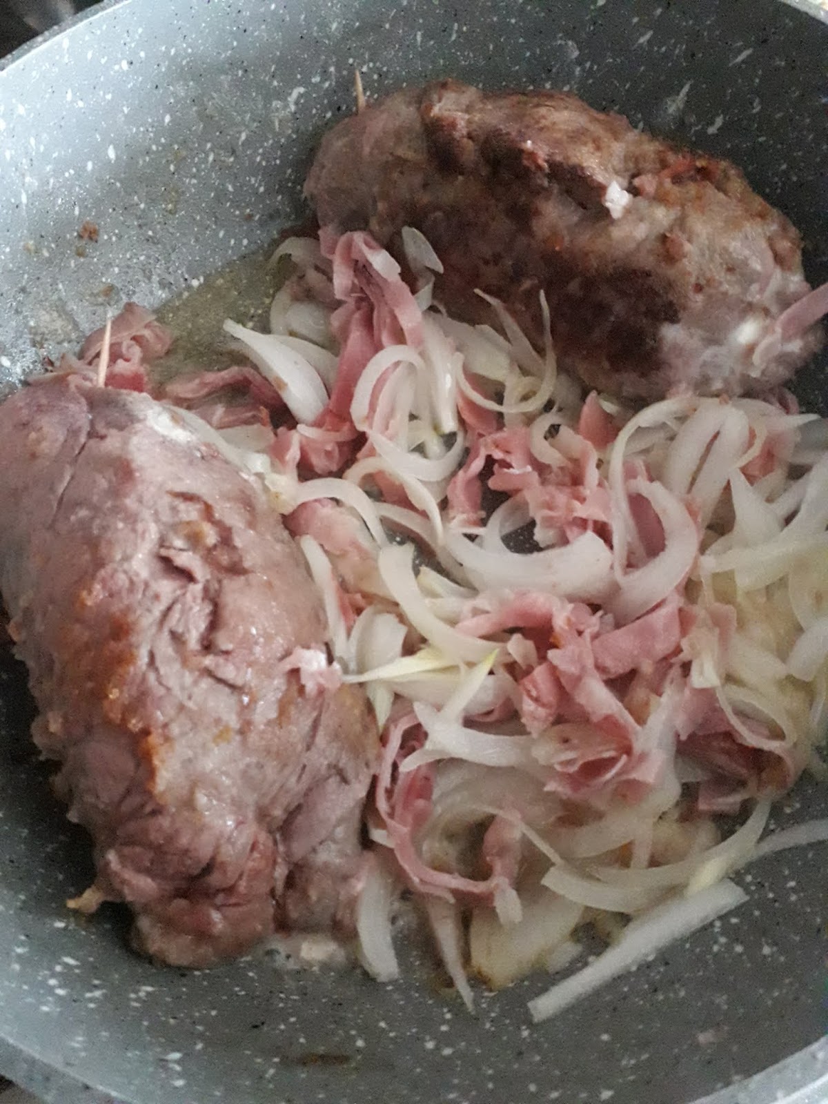 con stecchini,poggiamo gli involtini in una padella alta,con olio e burro,cipolle affettate