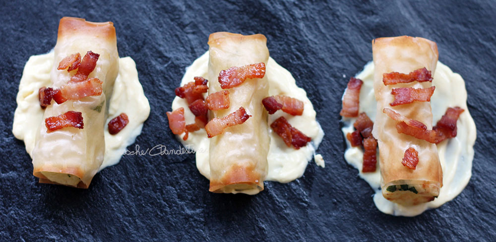Impiattate mettendo un cucchiaio di maionese sul piatto, quindi adagiate un rotolino e finite appoggiando qualche pezzetto di pancetta croccante. Buon appetito!