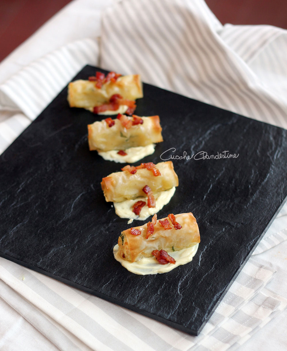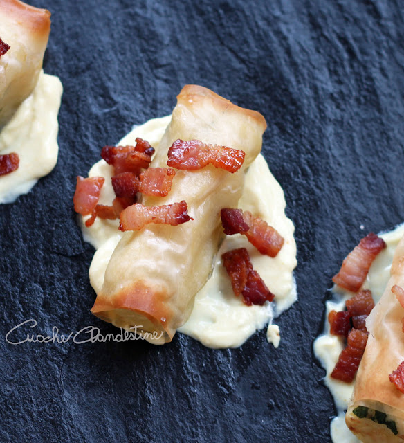 Li abbiamo serviti con croccante pancetta e maionese senza uova.