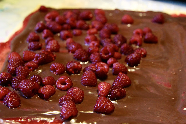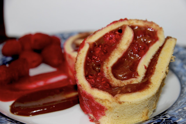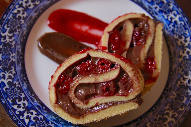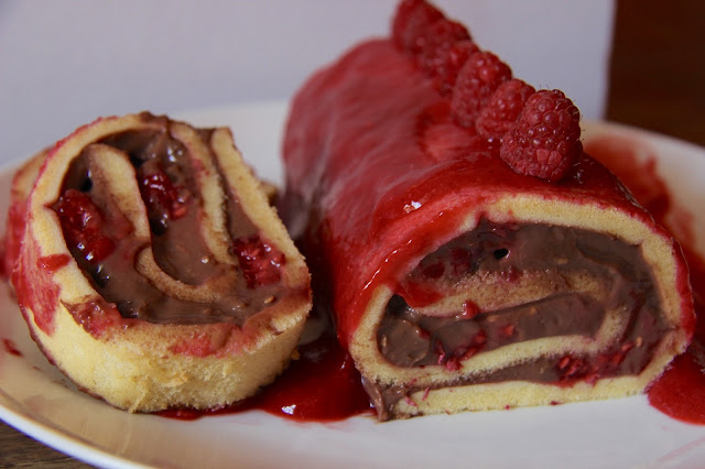 Srotoliamo il rotolo e cospargiamolo prima con parte della purea, poi con la crema al cioccolato ed infine aggiungiamo i lamponi.