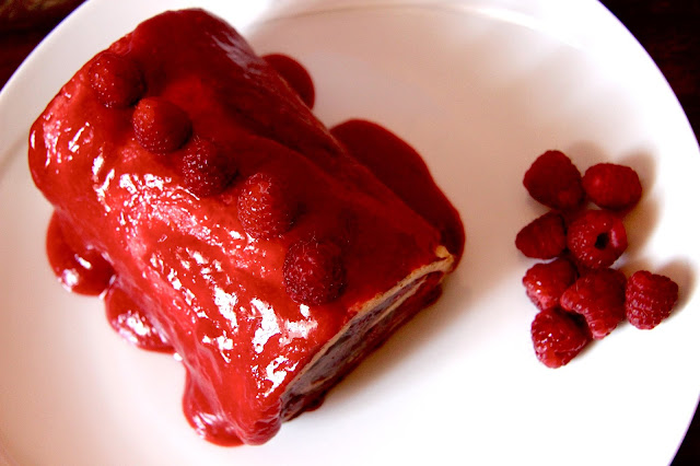Togliamolo dal frigo, posizioniamolo su un piatto da portata e ricopriamolo con la purea avanzata e decoriamo con altri lamponi.
