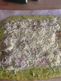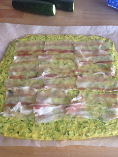 In una ciotola capiente sbattere le uova con il sale, aggiungere il formaggio grana ed infine le zucchine. Mescolare bene il composto e stenderlo in modo uniforme sulla carta forno ( l’idea è come quella di preparare la pasta biscotto per il rotolo dolce).