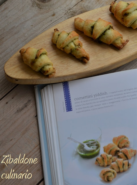 Questi cornettini yiddish, sono solitamente dei biscotti ebraici a forma di cornetto ripieni solitamente di cacao e nocciole, in questo caso l’autore ha preferito prepararli in versione salata, dando tante idee sulla farcitura.