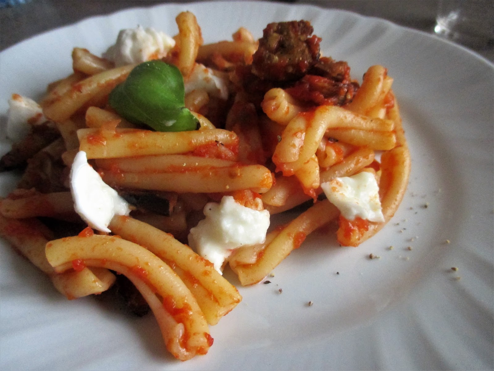 Cuocete la pasta in abbondante acqua bollente. Quando sarĂ pronta scolatela e fatela insaporire al pomodoro. Unite anche le melanzane e la mozzarella, amalgamate bene il tutto, quindi servite caldo.