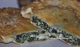 Tirare la pasta in una sfoglia sottile, tagliare dei dischi (10 cm di diametro) e farcirli con un ripieno preparato con 200 g di ricotta, 200 g di spinaci lessati e passati in padella con aglio e olio, una cucchiaiata di parmigiano grattugiato, noce moscata e se vi piace erba cipollina tritata.