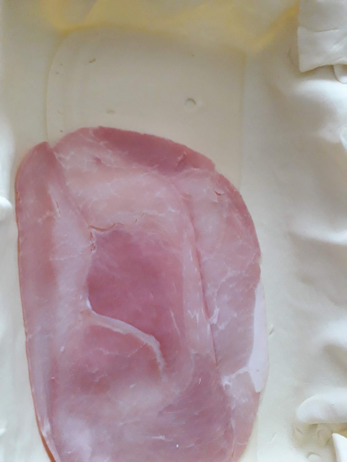 Foderare una teglia con la pasta sfoglia, coprire a strati con emmental a fette poi prosciutto,