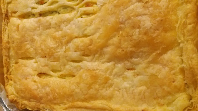 ricoprire il tutto con altra sfoglia,bucarla con una forchetta ed infornare a circa 190° x 20′.