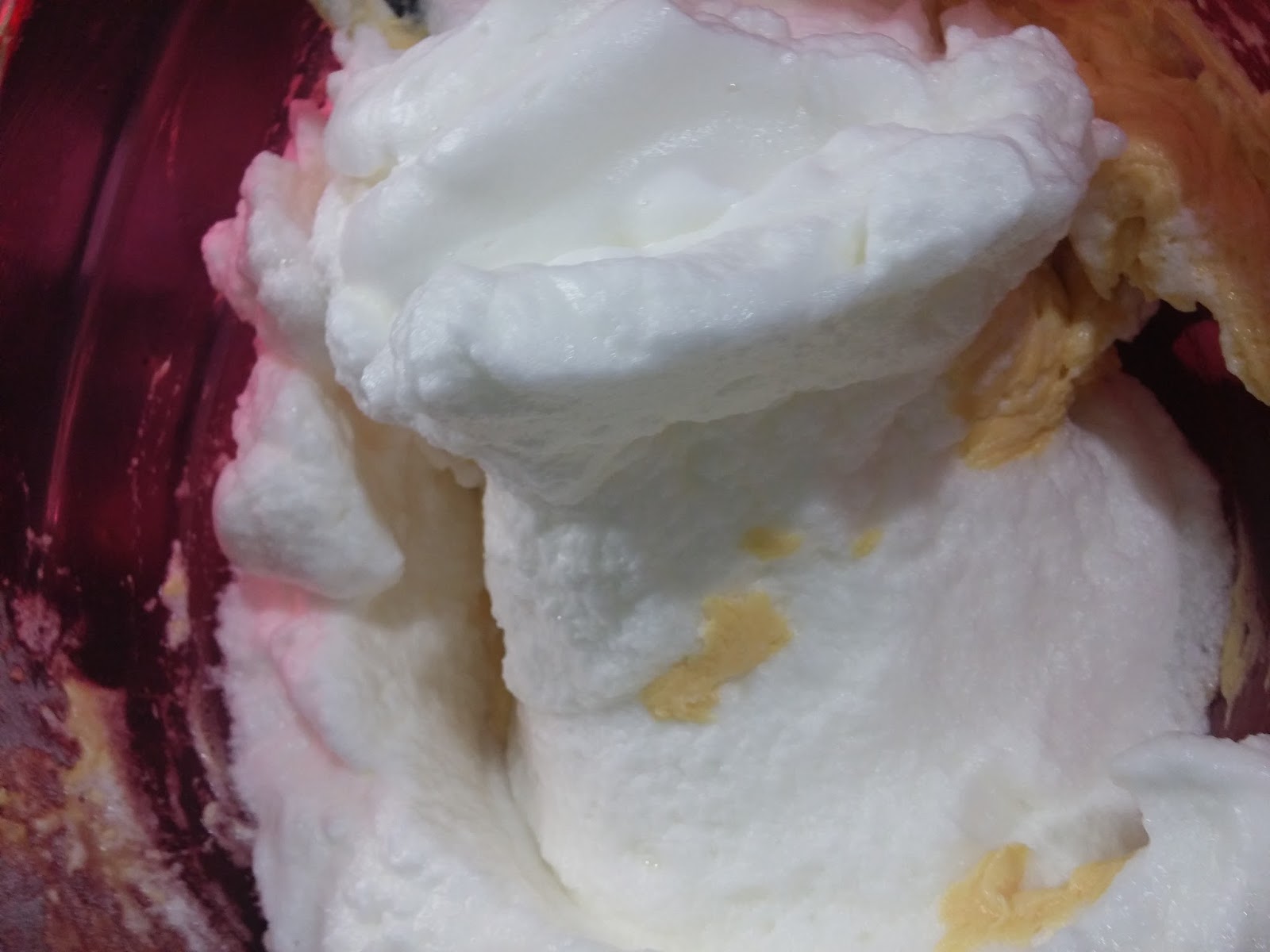 Montare gli albumi a neve ferma. Setacciare il lievito,la farina ed il sale ed aggiungerli insieme agli albumi al composto poco per volta con un movimento a nastro.