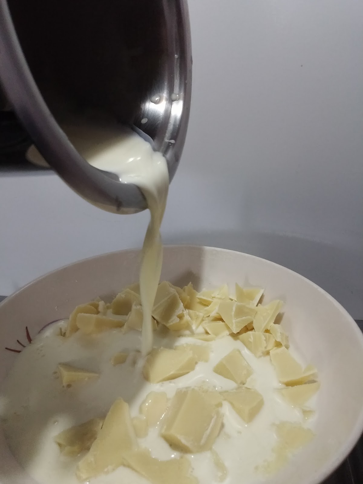 Preparare la copertura portando a bollore la panna. Spezzettare la cioccolata in una ciotola e versare al suo interno la panna.