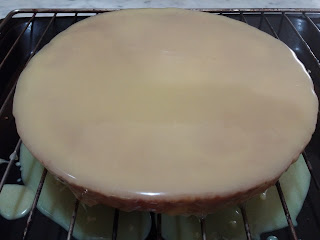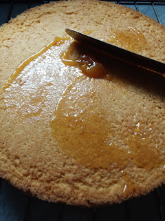 Chiudere la torta e versare un velo sottile di marmellata su tutta la superfice (bordi compresi).